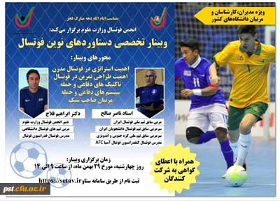 امتیاز دهید : وبینار تخصصی دستاوردهای نوین فوتسال اداره کل تربیت بدنی وزارت عتف دوشنبه 27 بهمن 1399 ساعت 10:30