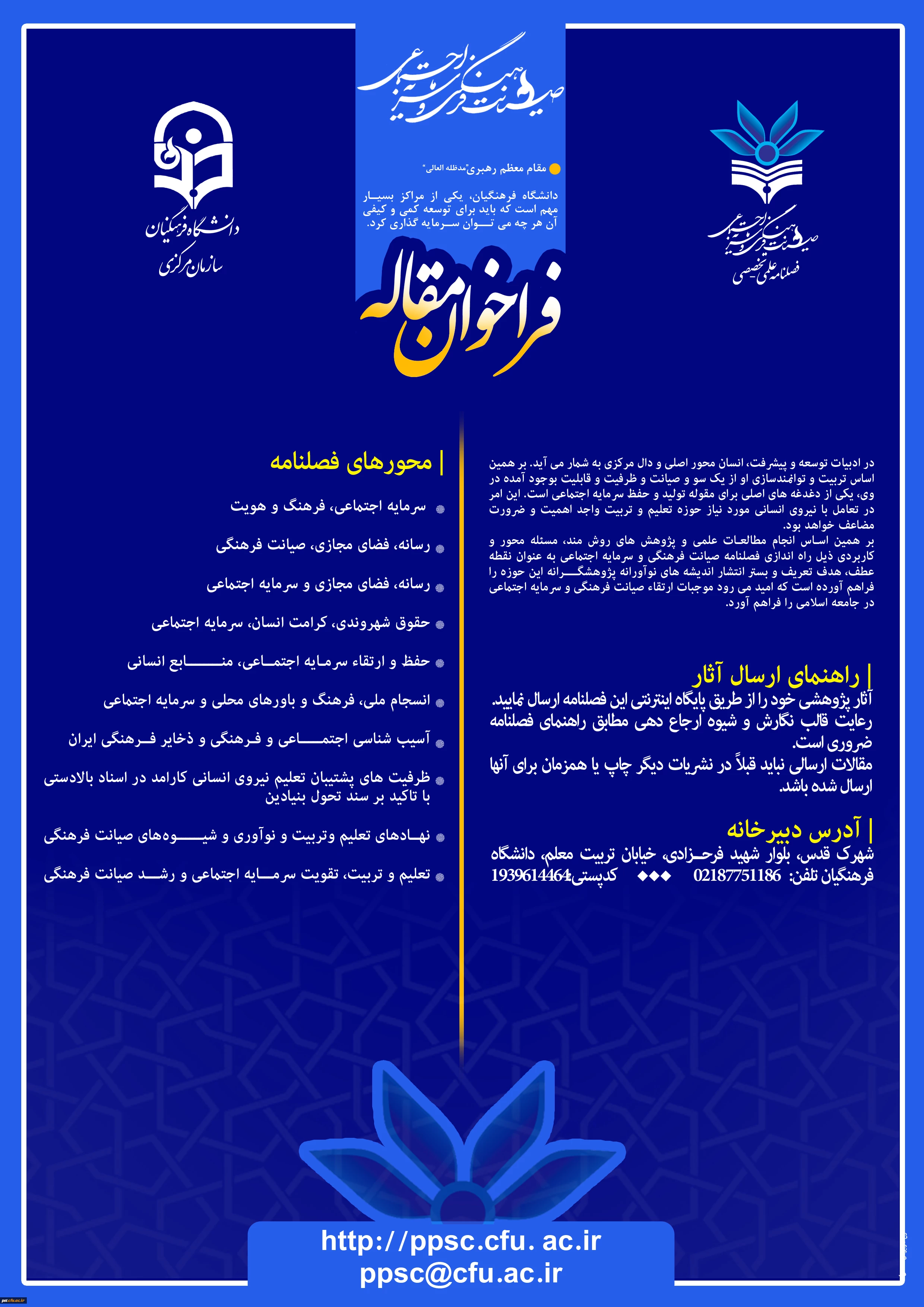 امتیاز دهید : فراخوان مقاله فصلنامه علمی تخصصی صیانت فرهنگی و سرمایه اجتماعی 3 یکشنبه 29 فروردین 1400 ساعت 19:12