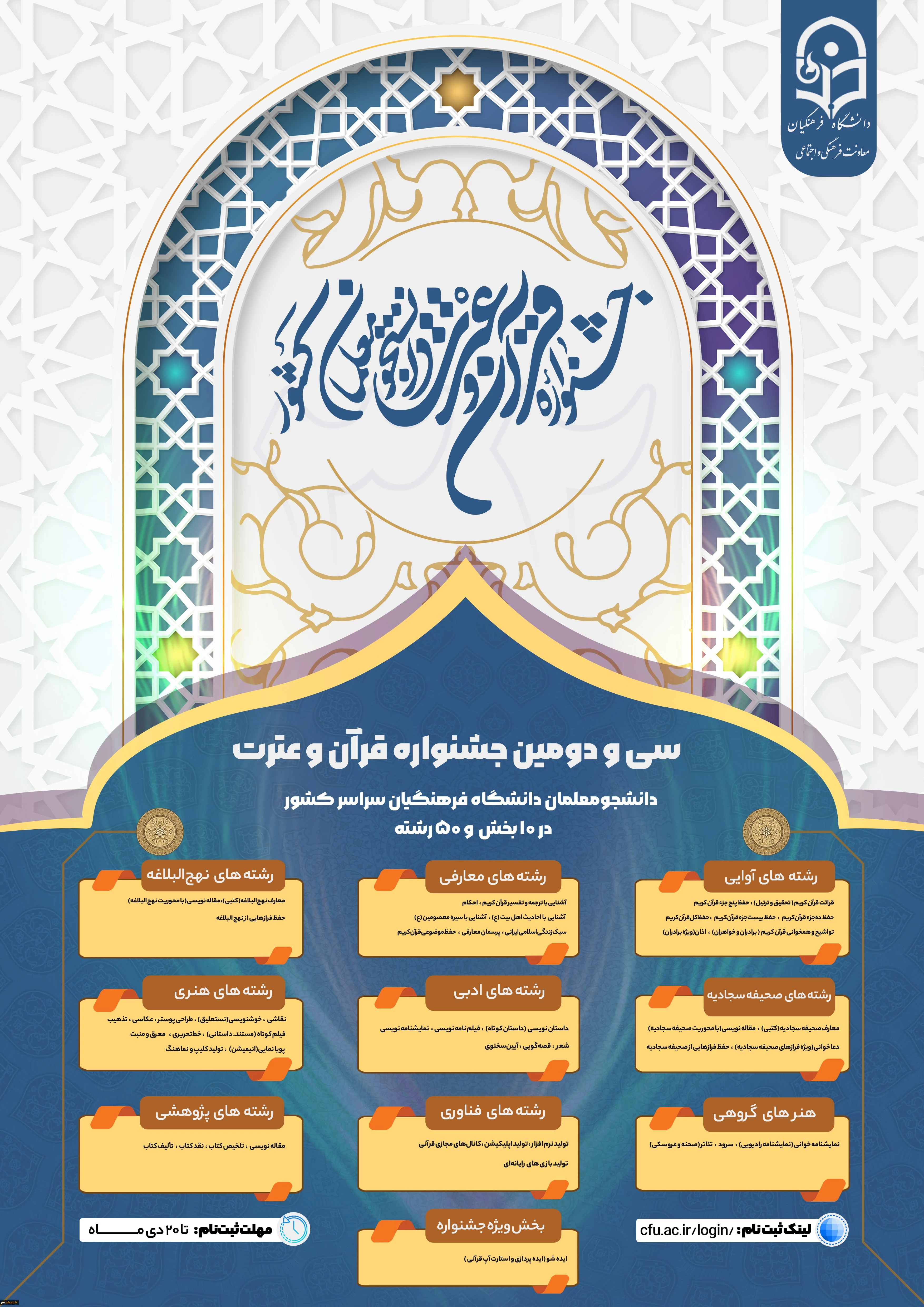 امتیاز دهید : سی و دومین جشنواره قرآن و عترت دانشجومعلمان دانشگاه فرهنگیان سراسر کشور 2 چهارشنبه 15 دی 1400 ساعت 10:27