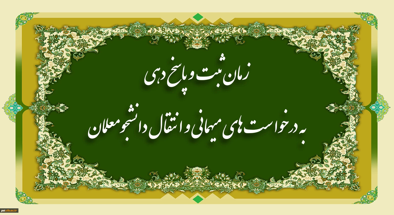 امتیاز دهید : زمان ثبت و پاسخ دهی به درخواست های میهمانی و انتقال دانشجومعلمان 2 یکشنبه 22 خرداد 1401 ساعت 9:19