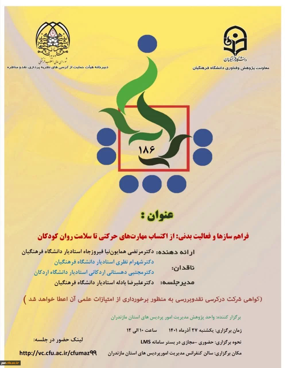 یکصد و هشتاد و ششمین کرسی ترویجی با عنوان " فراهم سازها و فعالیت بدنی : از اکتساب مهارت های حرکتی تا سلامت روان کودکان  2