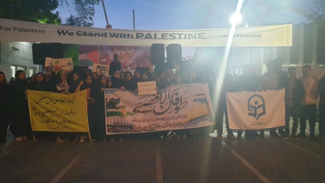 حضور دانشجویان دانشگاه فرهنگیان فارس در تجمع دانشجویان استان فارس در حمایت ازخیزش جامعه دانشگاهی آمریکا و اروپا در حمایت از مردم غزه